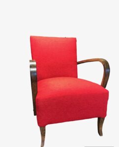 Tuoli kuin mansikka. 50- luvun nojatuoli jossa uusittu kankaat ja kunnostettu puuosat.
