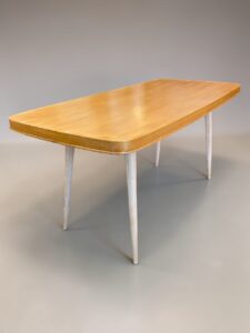 Kuvissa pöydän jalat näyttävät valkoisilta mutta ne ovat koivua ja lakatut.