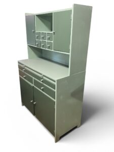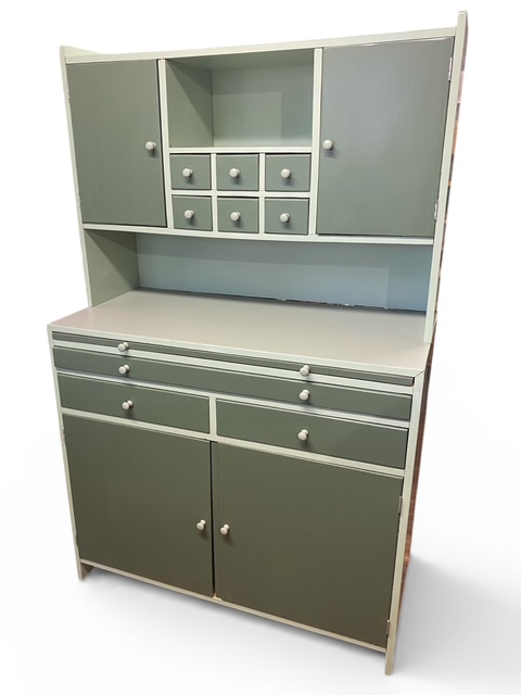 Siistikuntoinen emännänkaappi. Laatikot ja kaapin ovet uudelleen maalattu, samoin tasopinta. Sivuilla vähän elämän jälkiä. Kaapin leveys on 104,5 cm, syvyys 49,5 cm . Tason korkeus on 92 cm ja kokonaiskorkeus 166cm.