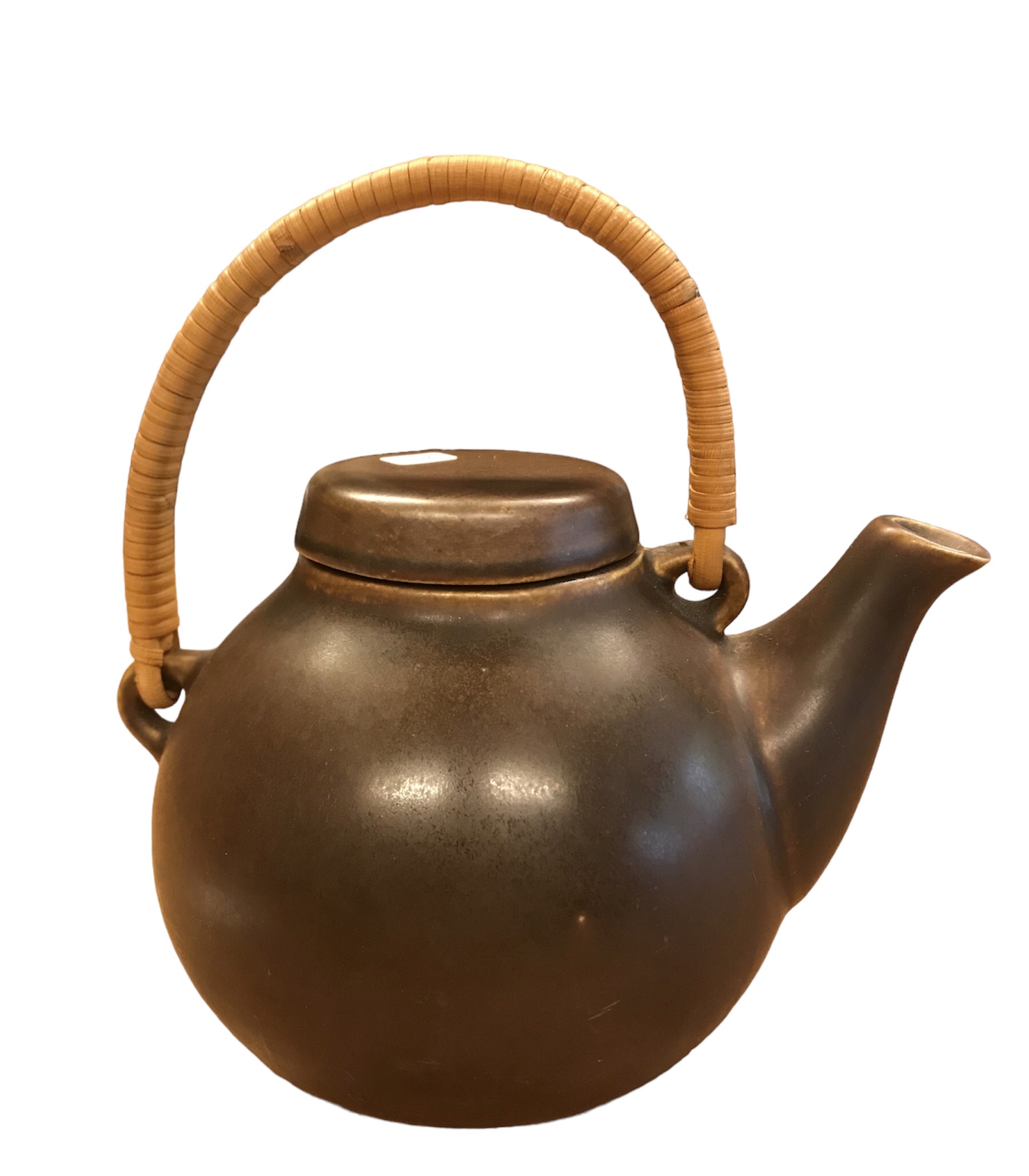 Arabian GA teekannu rottinkikahvalla, suunnittelija Ulla Procope. Ollut tuotannossa 1955-1972.