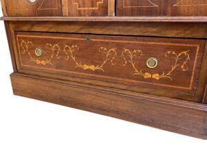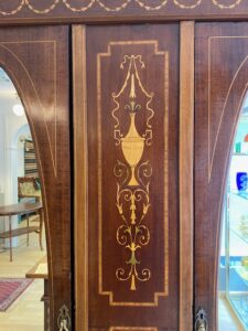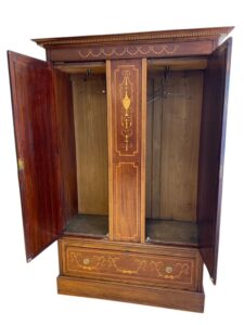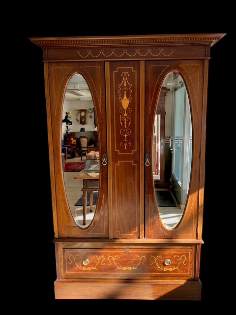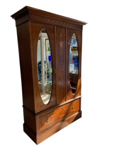 Puinen komea empire vaatekaappi intarsia koristuksella, mahonkia ja tammea. Kaapissa elämisen jälkiä mutta ikäisekseen ryhdikäs ja siisti.