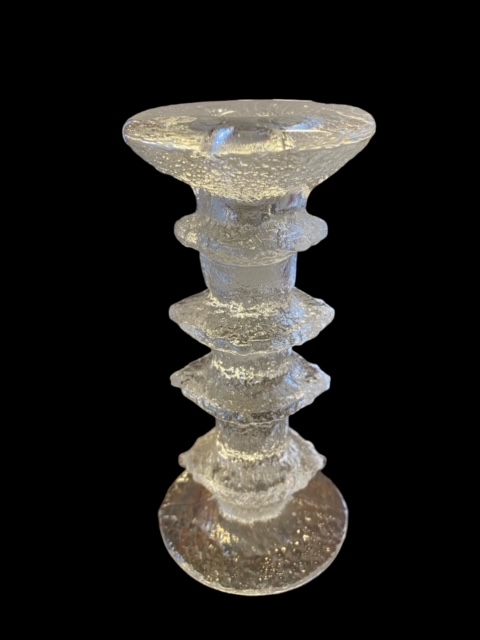 Timo Sarpanevan suunnittelema, Iittalan valmistama neljä solmuinen kynttilänjalka. Vanhaa mallia ilman metallista kynttilänpidikettä, pohjassa TS signeeraus, Iittalan tarra. Korkeus noin 18 cm.