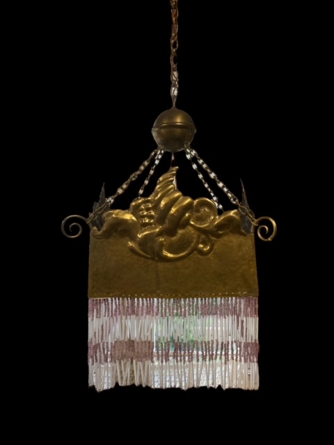 Messinkinen jugend-valaisin pakotetuilla kuvioilla 1900-luvun alusta.  Valaisimen korkeus noin 65 cm, sivut 21 cx 21 cm.