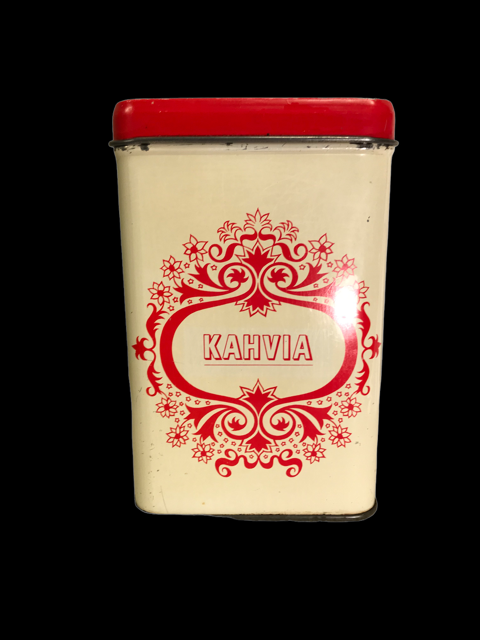 Kahvipurkki, punaisella kuviolla ja tekstillä.