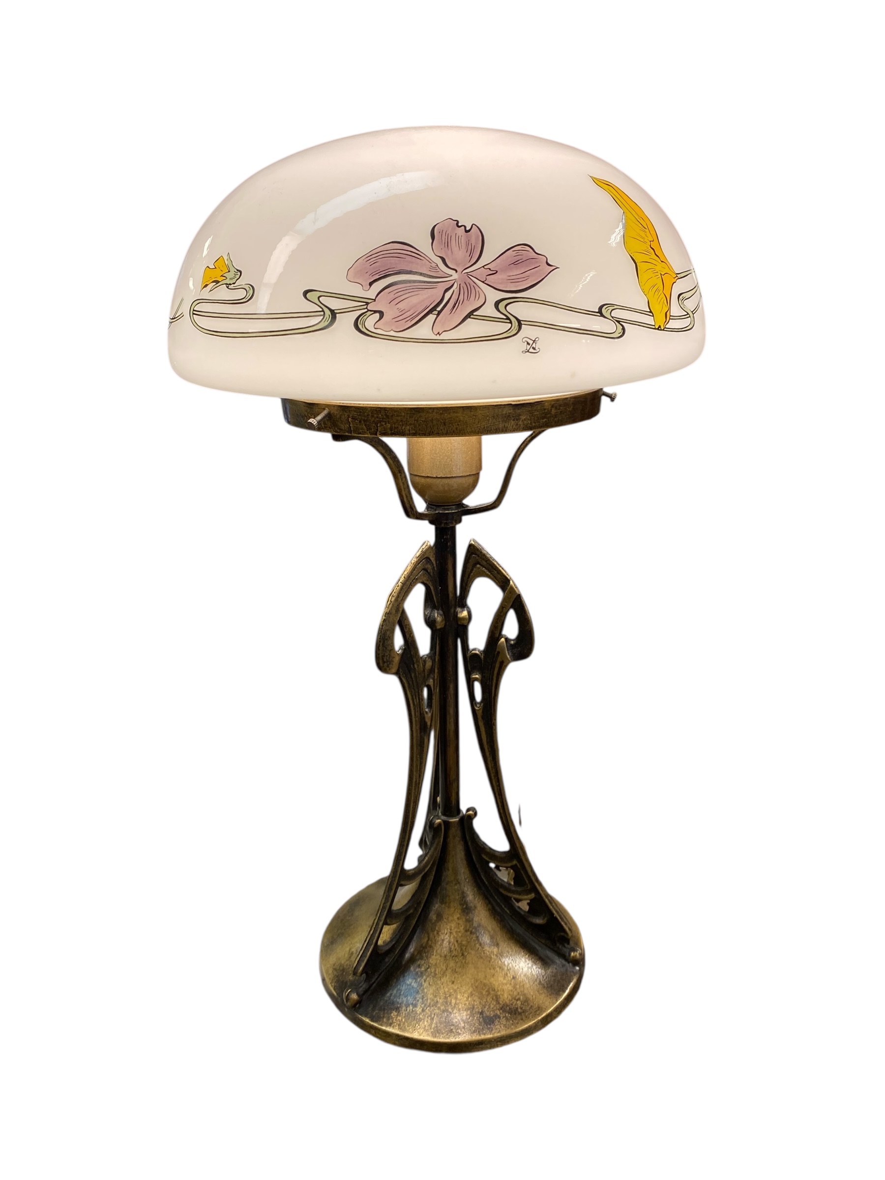Art Nouveaun / Jugendin tyylinen pöytälamppu messinkiä ja käsinmaalattua lasia.