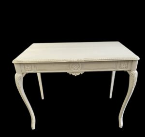 Kaunis rokokootyylinen pöytä. Pöydän korkeus 78 cm, pituus 103 cm ja syvyys 70 cm. Pöydässä vähän elämän jälkiä.