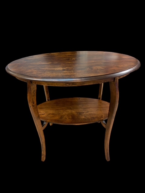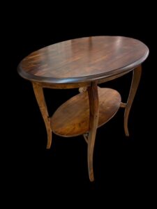 Vanha ovaali koivuinen sivupöytä.  Pöytälevyn koko on 90 x 61 cm ja korkeus 76 cm.