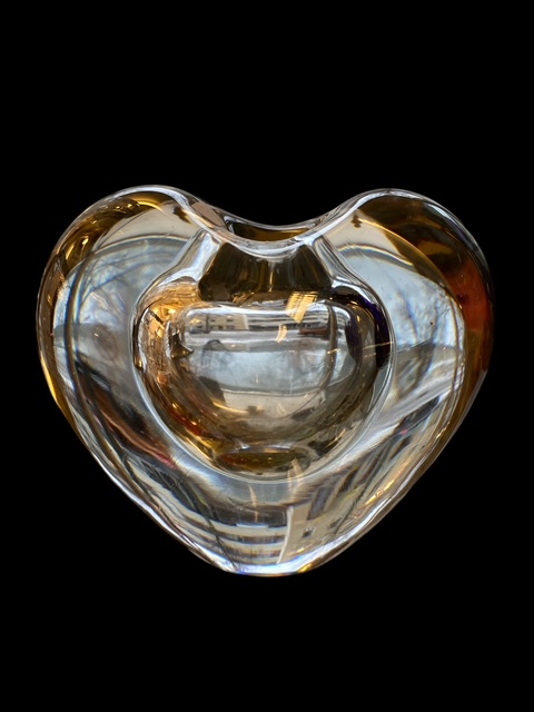 Tapio Wirkkalan 1953 suunnittelema lasiveistos ”Sydän” kirkasta lasia. Valmistaja Iittala. Korkeus 95 mm, pohjassa kulumisen jälkiä, ei signeerattu.