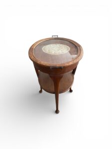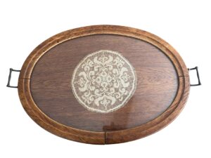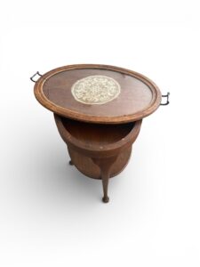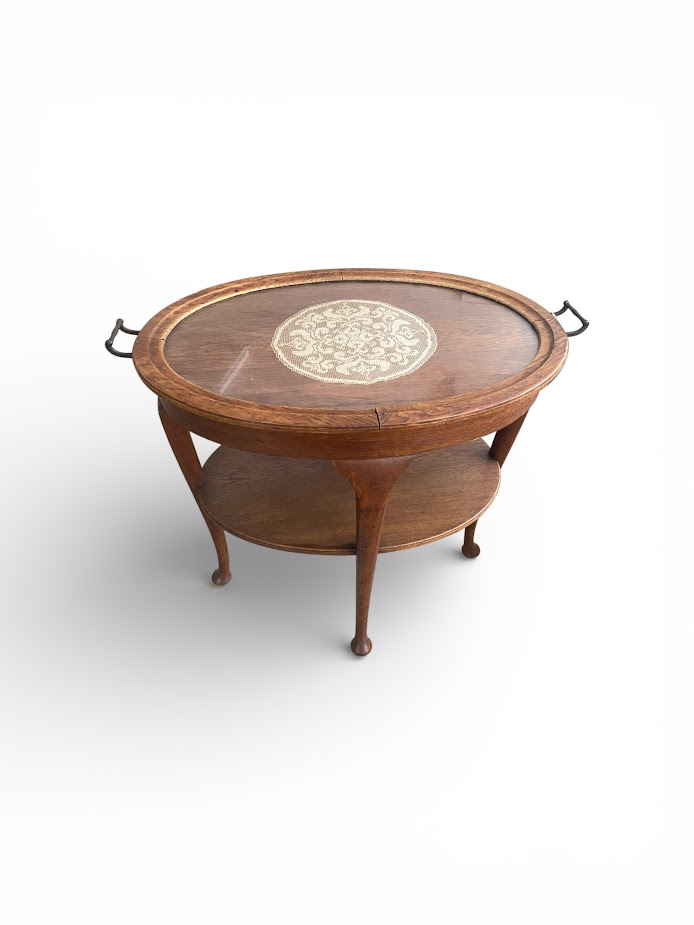 Vanha tamminen tarjotinpöytä lasikannella. Kannessa on kantokahvat ja sen voi nostaa pois. Pöydän kannen alla on säilytystila. Pöydän lasin alla on vanha pitsiliina. Pöydän kunto on hyvä. Pöydän korkeus on 70 cm, pöydän koko 74 x 54 cm.