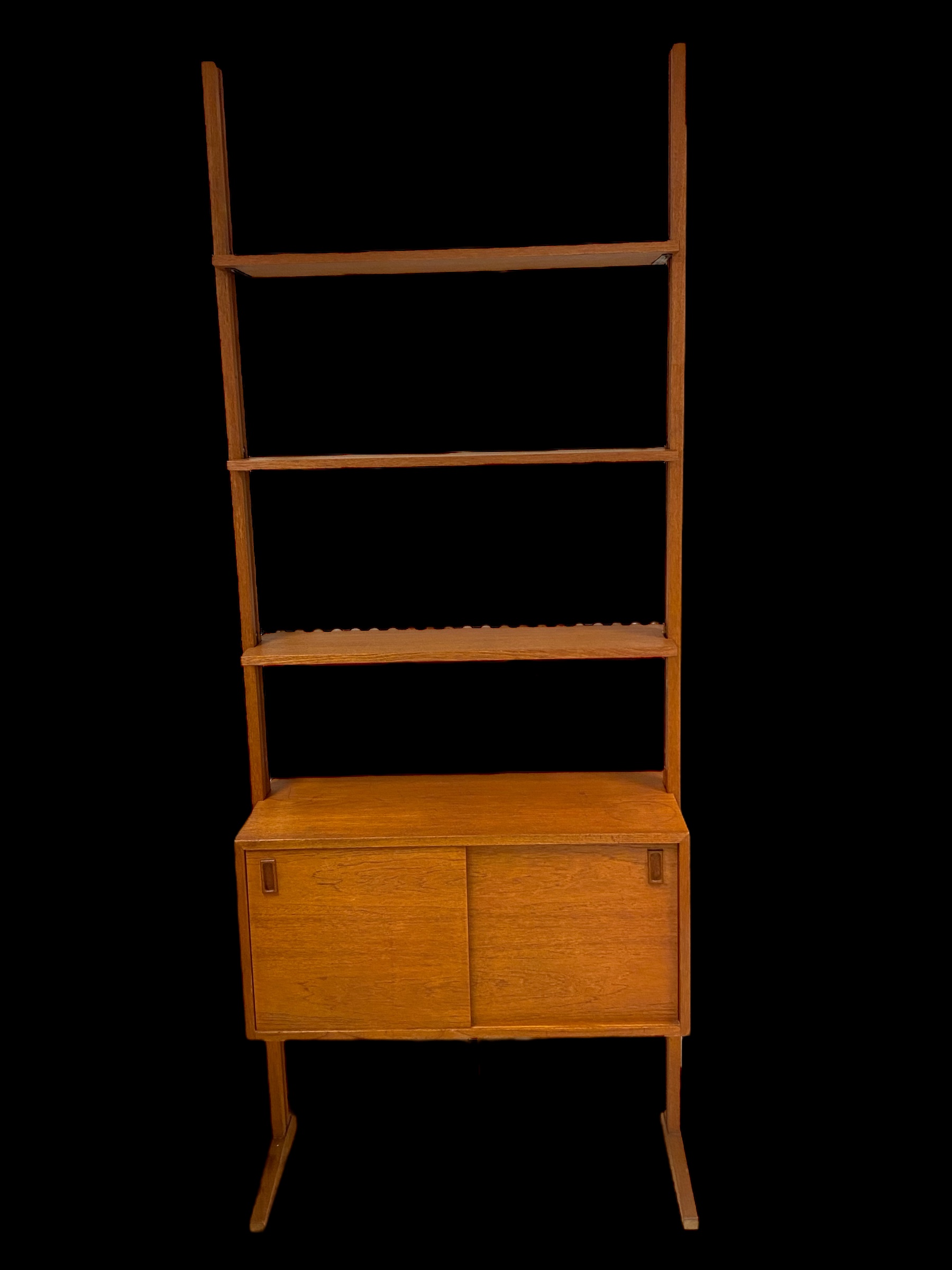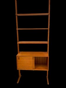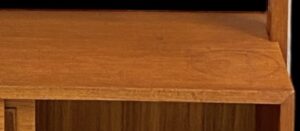 60-luvun teak-viilutettu kirjahylly. Kaapin ylä pinnassa kukkaruukun jälki ( kuvassa) . Hyllyn korkeus 210 cm, leveys 83 cm ja syvyys 36 cm.