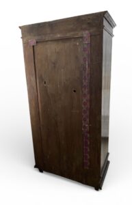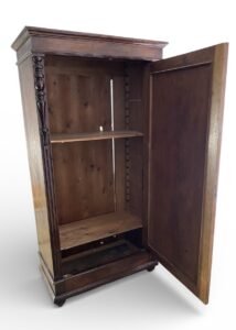 Komea uusrenesanssikaappi hyllyillä. Kaapissa hyllyjä 4 kpl. kaapin korkeus on 191 cm, syvyys noin 50 cm, leveys noin 93 cm.