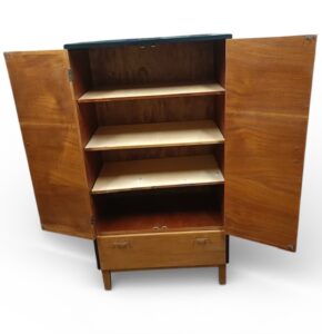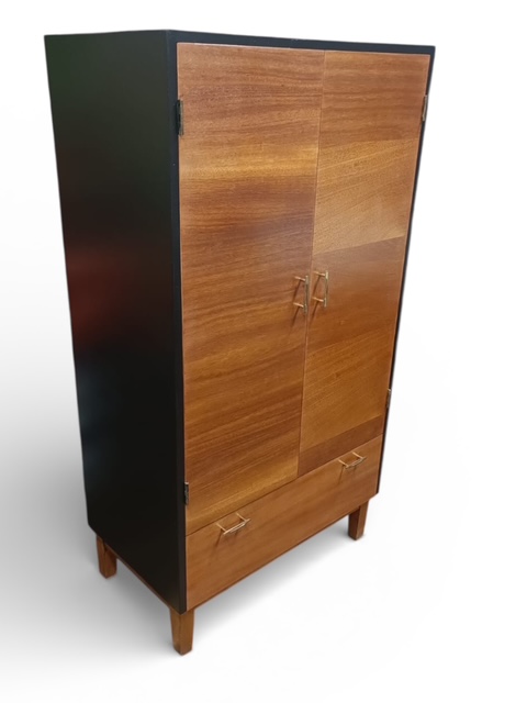 Tyylikäs pienen tilan teak vaatekaappi / kaappi 60-luvulta. Kaapin pinnat kunnostettu. Kaapin korkeus on 13o cm, leveys 69,5 cm ja syvyys 40 cm.