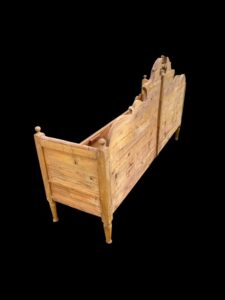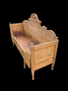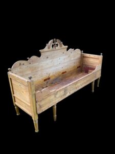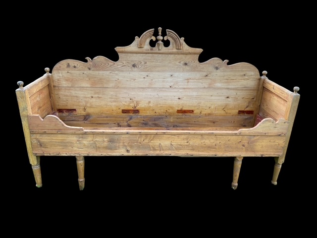Vanha kaunis sivustavedettävä puusohva. Sohvan leveys on noin 184 cm, syvyys noin 55 cm.
