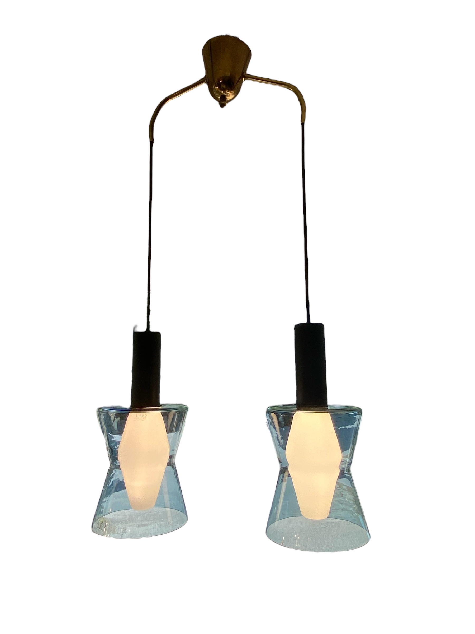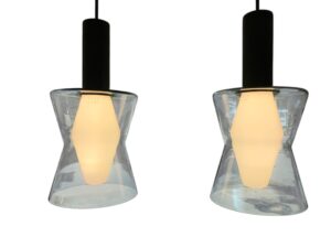 Wirkkalan K2 -135 – kattovalaisin tuplana, harmaansinistä lasia. Kummassakin tarrat ”Original Tapio Wirkkala design ”. Valmistaja Iittala/ Idman Oy. Lampuissa Wirkkalan suunnittelemat WIR-polttimot.